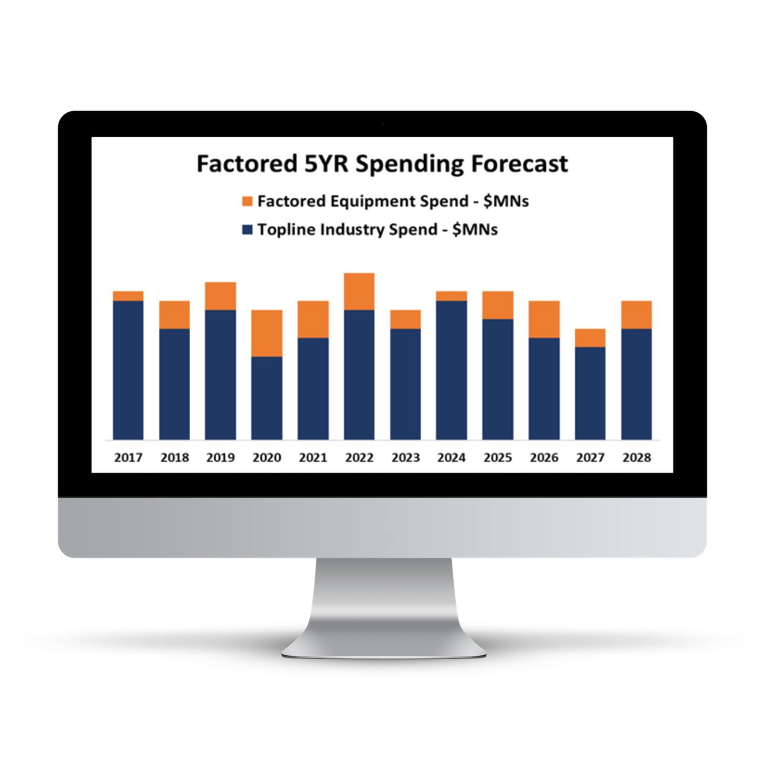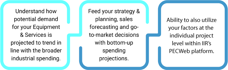 Our forecasts are based on a combination of actual projects being tracked globally, all of which are updated daily, and our proprietary factoring methodology. This provides end-users with a unique bottom-up assessment of the current, 5YR future and 5YR historical demand and spending for a given range of industrial equipment and services.
